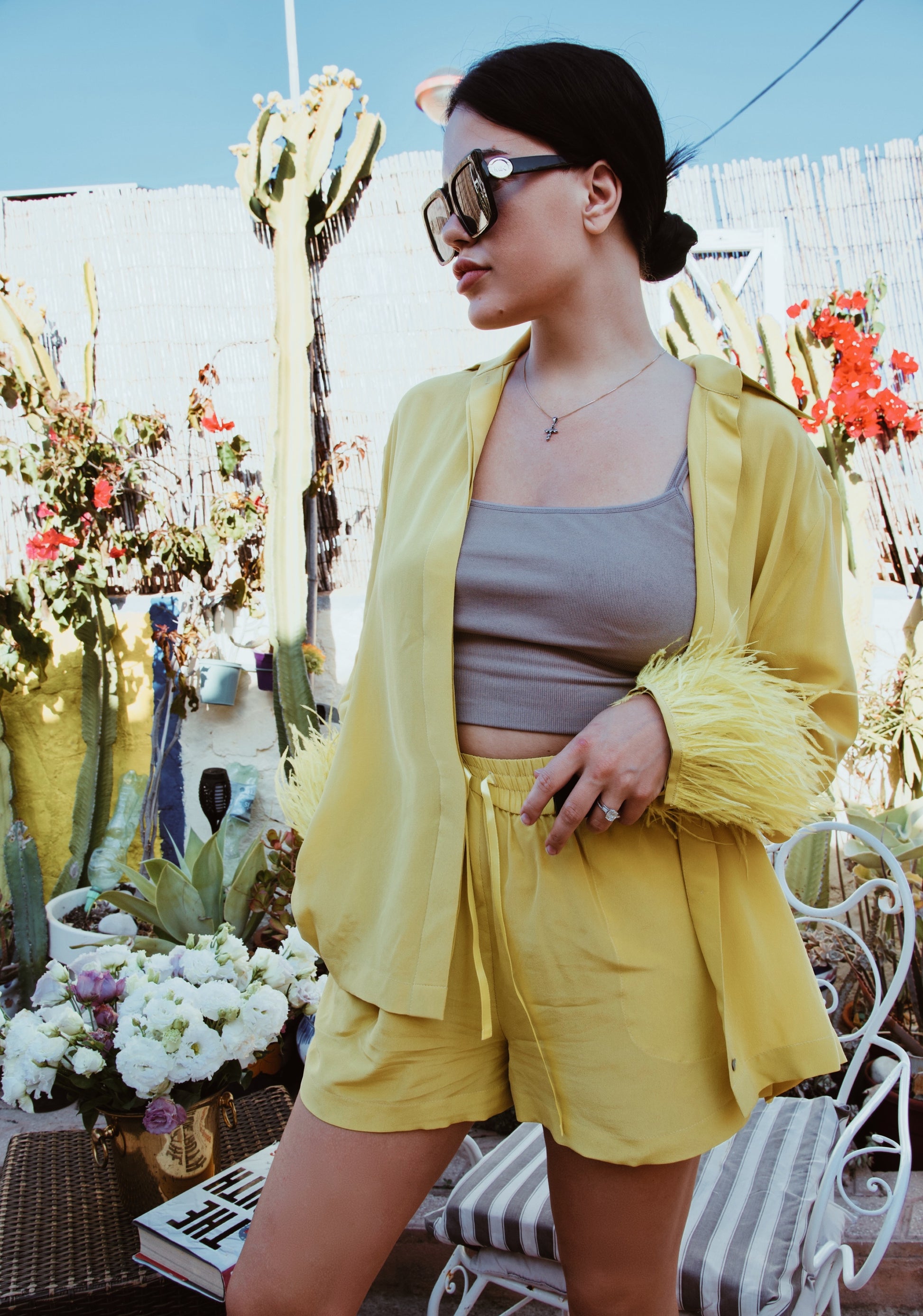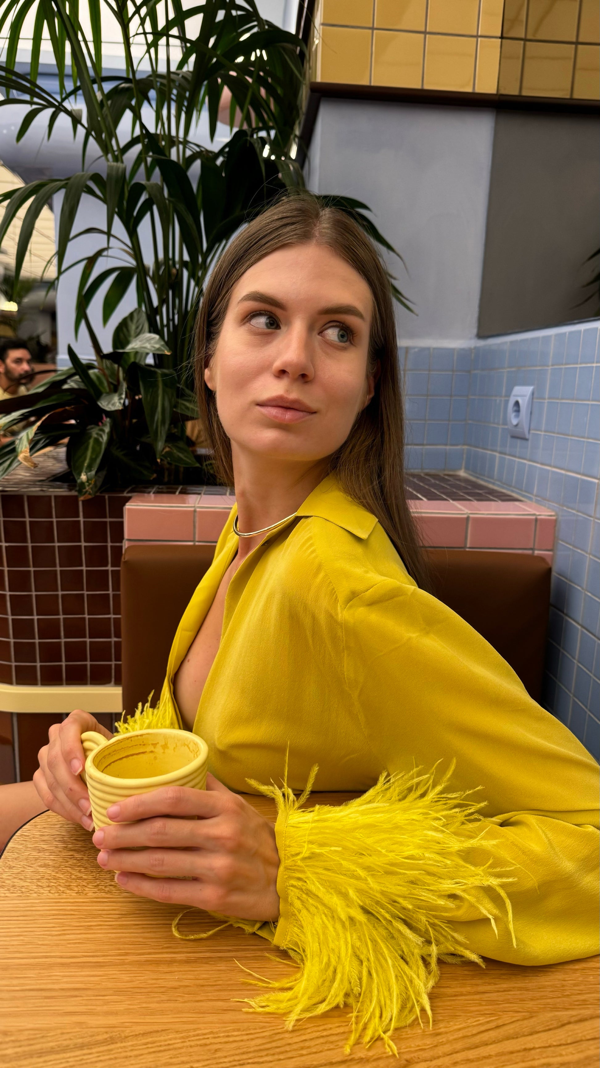 Experience the ultimate luxury with our Lemon Crepe Silk Shirt. Made from pure silk, this elegant shirt boasts removable ostrich feathers for a touch of sophistication. Elevate your wardrobe with this exclusive piece, featuring natural shell buttons. Perfect for any occasion.