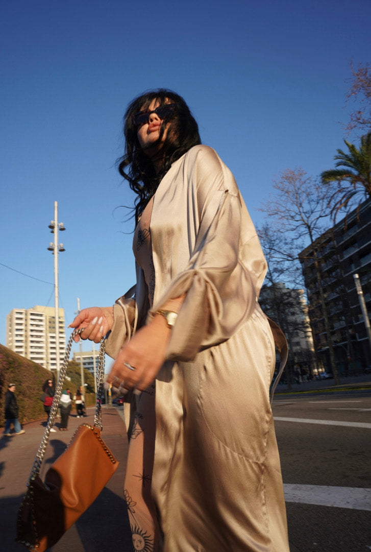 Luxurious versatile Trench Kimono is a garment that will emphatize your grace and sophistication. Made from natural silk, it is light and flowing. It is perfect for different climates and events - evening cocktail on the terrace in Barcelona, autumn shopping in New York or a summer walk in Stockholm.