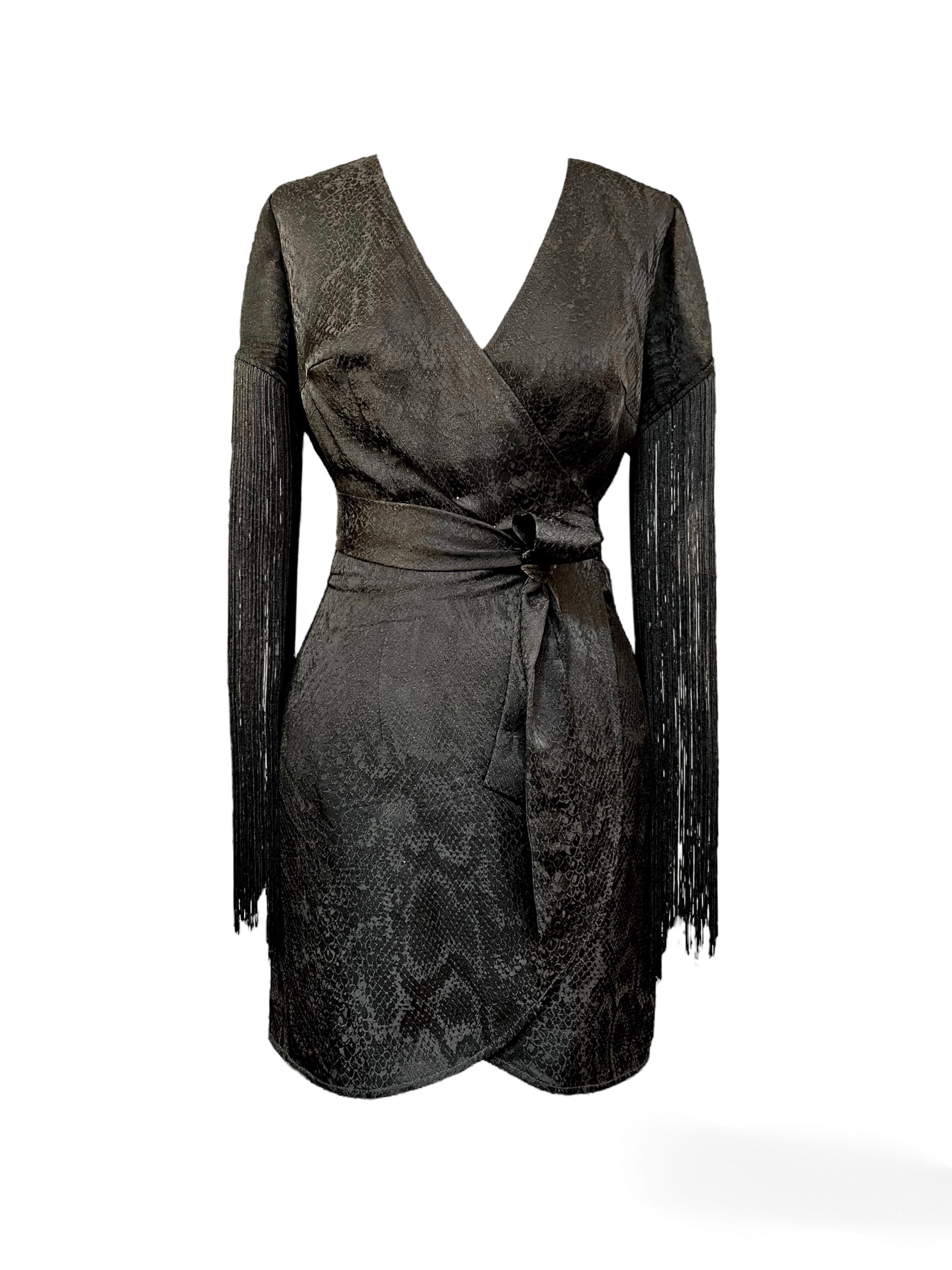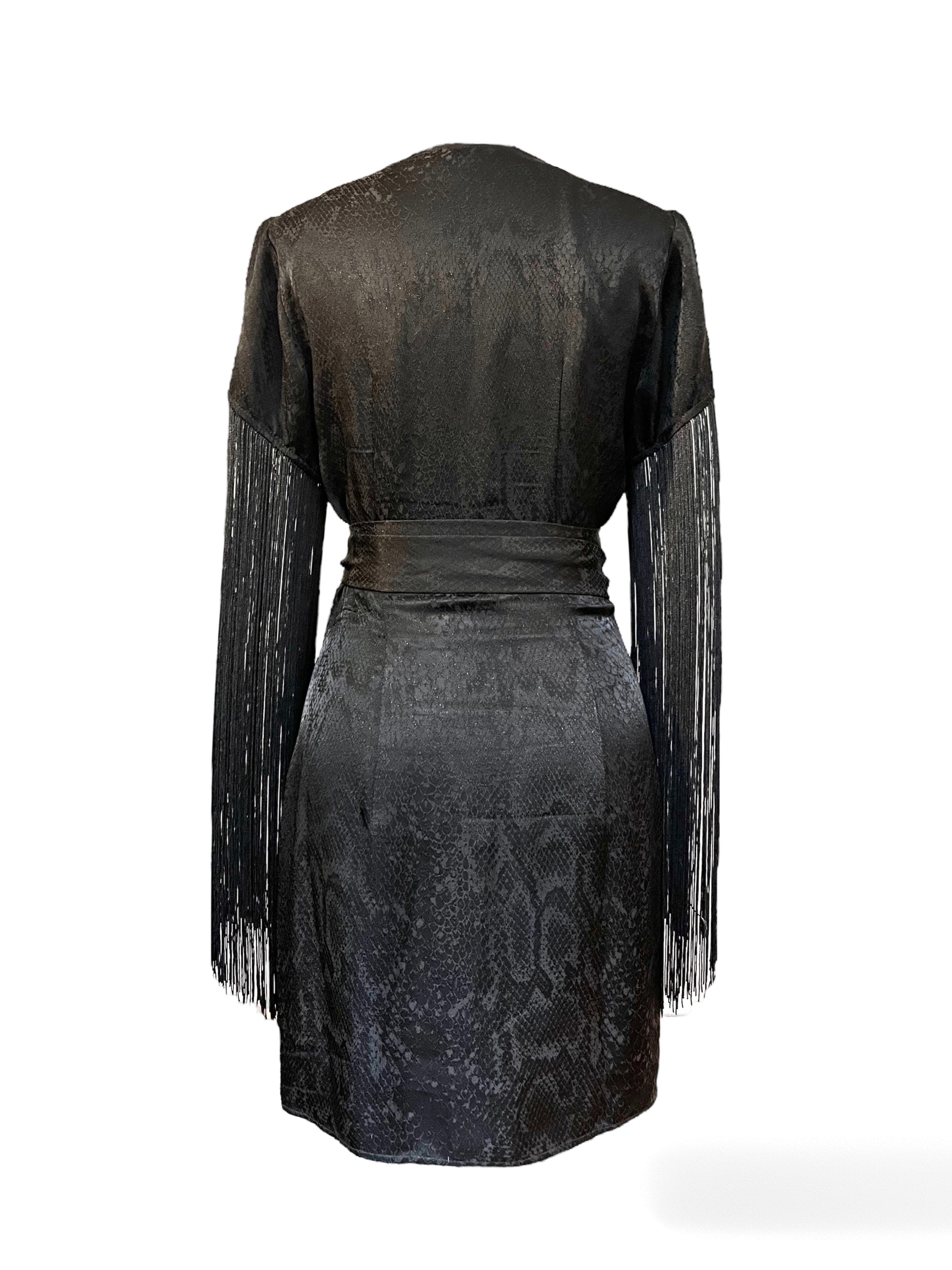 Beautiful dress made from snake skin jacquard and fringed sleeves is perfect choice for events, parties and dates. You will not go unnoticed!